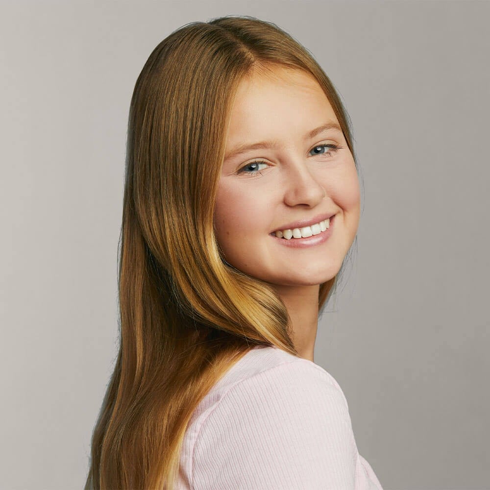 At age ten, patient had a big overjet with the top teeth protruding beyond the bottom. She had two phases of treatment. The first helped her jaws to grow more harmoniously and the second aligned her teeth and bite. At age 13, she was proudly displaying her new smile.